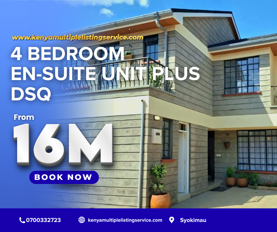 Looking for your dream home in Syokimau, Nairobi? This stunning 4-bedroom all en-suite home with a detached servant quarter (DSQ) offers the perfect combination of comfort, modern design, and convenience. Ideal for families seeking space, privacy, and a secure environment, this property also makes a smart real estate investment.