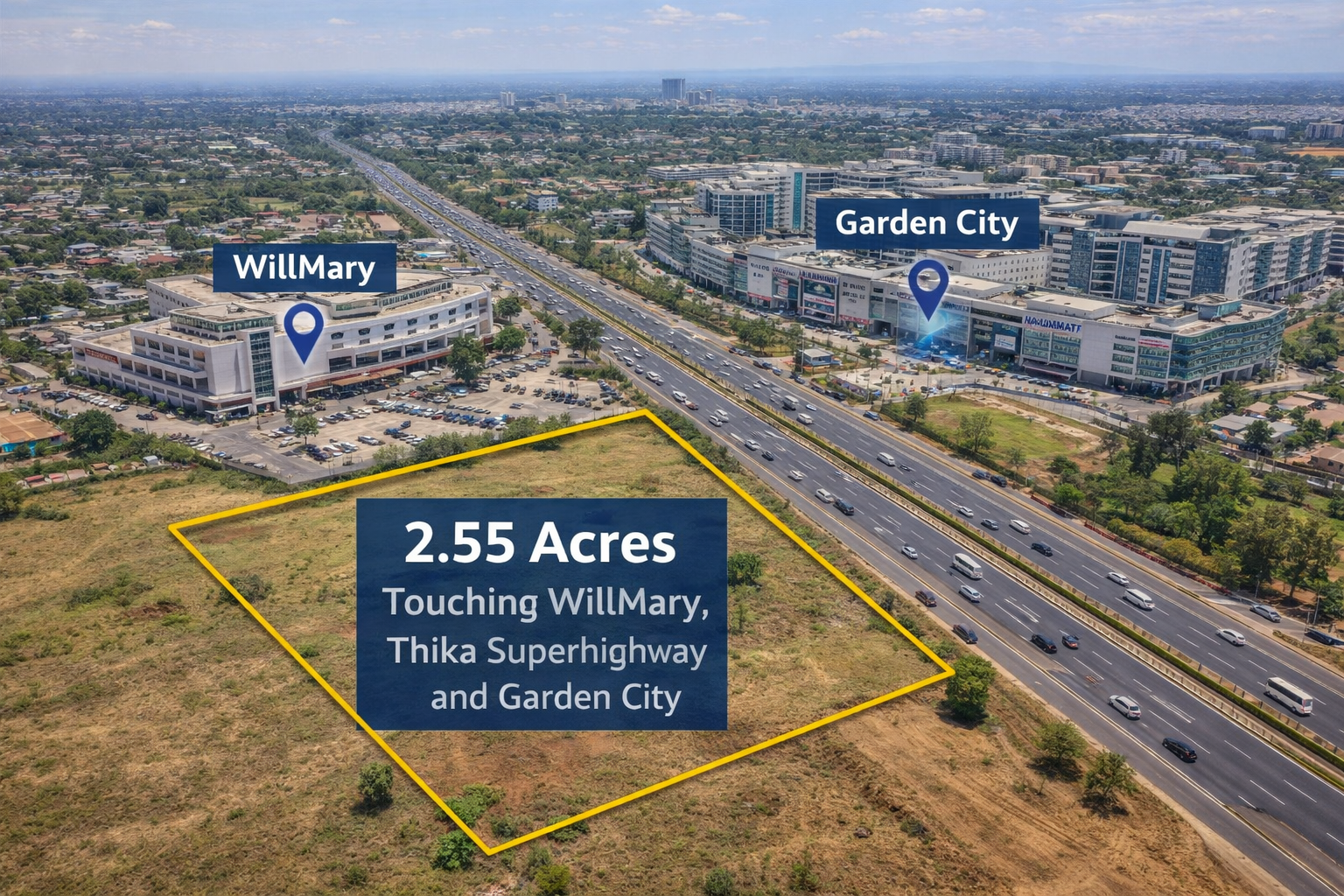 One of our standout listings includes 2.55 acres touching Thika Superhighway, strategically located near major landmarks like WillMary and Garden City. This property offers high visibility and is ideal for commercial or mixed-use development.